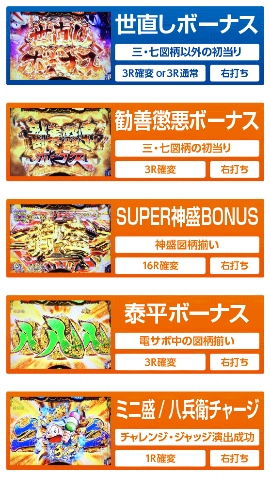 電サポ中に当選する3R確変大当り。図柄揃い後の昇格演出でSUPER神盛BONUSにランクアップする場合もある。大当り消化後はST128回転のSUPER神盛RUSHに突入。