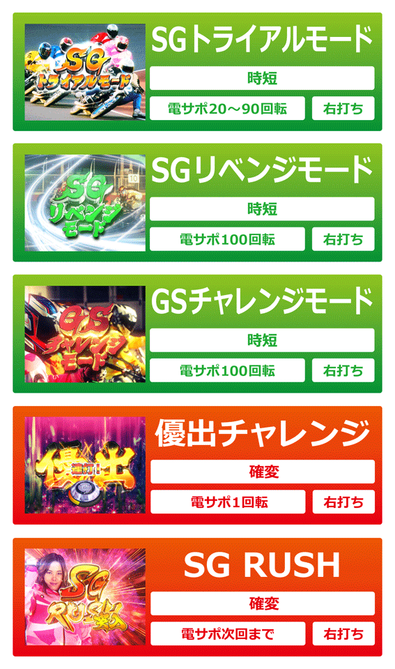 次回大当りまで電サポが続く確変モード(リミット到達時除く)。液晶でバトルが始まると大当りとなり、バトル中にライバルを追い抜けばSG RUSH継続、バトル敗北でSGリベンジモードへ突入する。