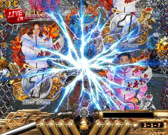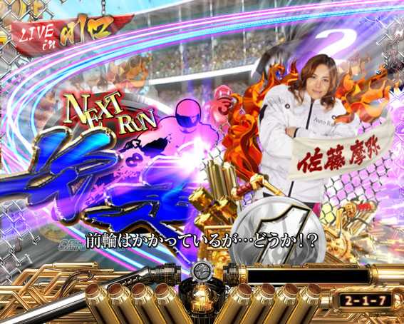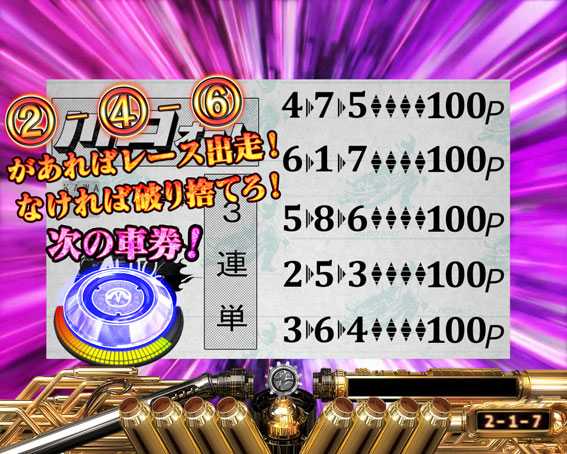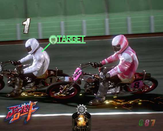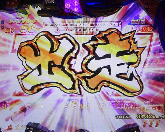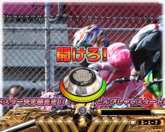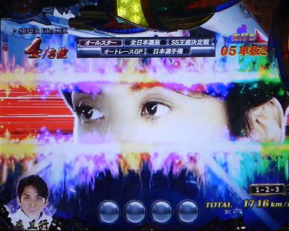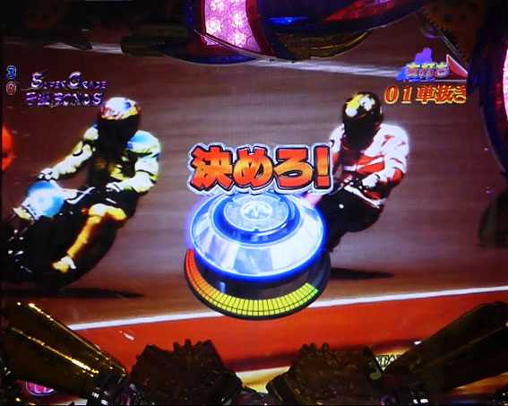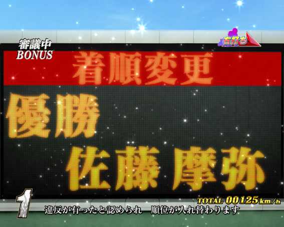 プレミアムを除けば最も期待できるスーパーリーチ。レースで8号車(ピンクの競走車)が勝利すれば大当りとなる。