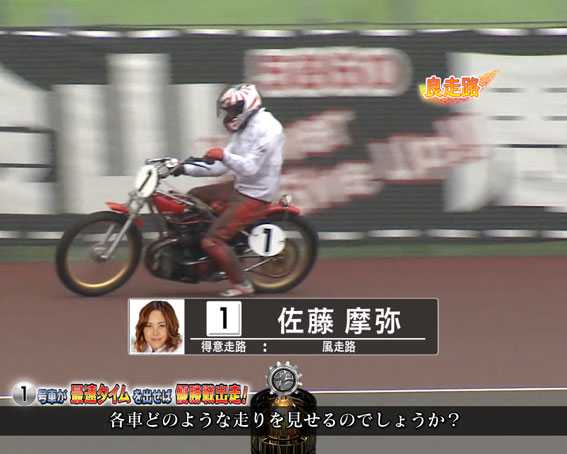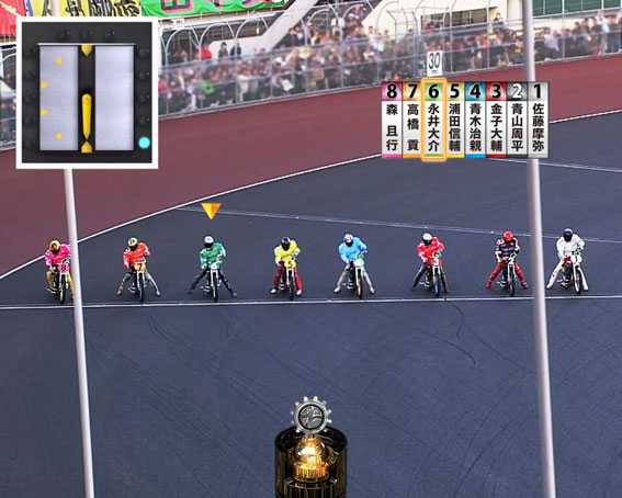 ・出走表 (1号車が女性・バッシーポイント) ・ハンデあり ・導光板(赤) ・ゴール前(競り合い人数が少ない) ・カットイン(赤・ピンク) |