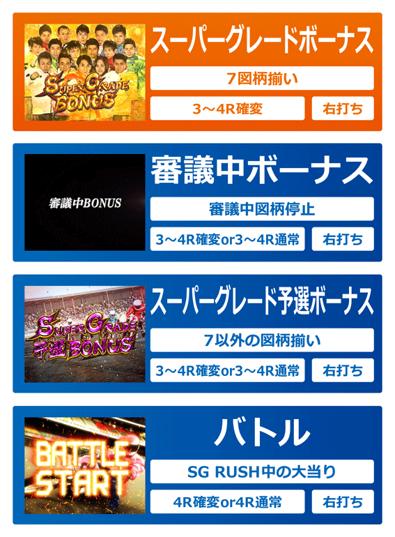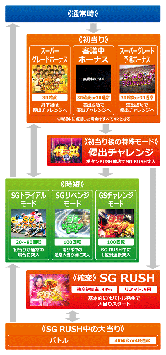リーチハズレ後などに審議中図柄停止で発生する確変or通常大当り。初当りだと3Rで、時短中なら4Rとなる。ラウンド中は審議演出が発生し、着順が変更されれば優出チャレンジ経由でSG RUSH突入(※)、変更なしならSGトライアルモードorSGリベンジモードへ移行する。