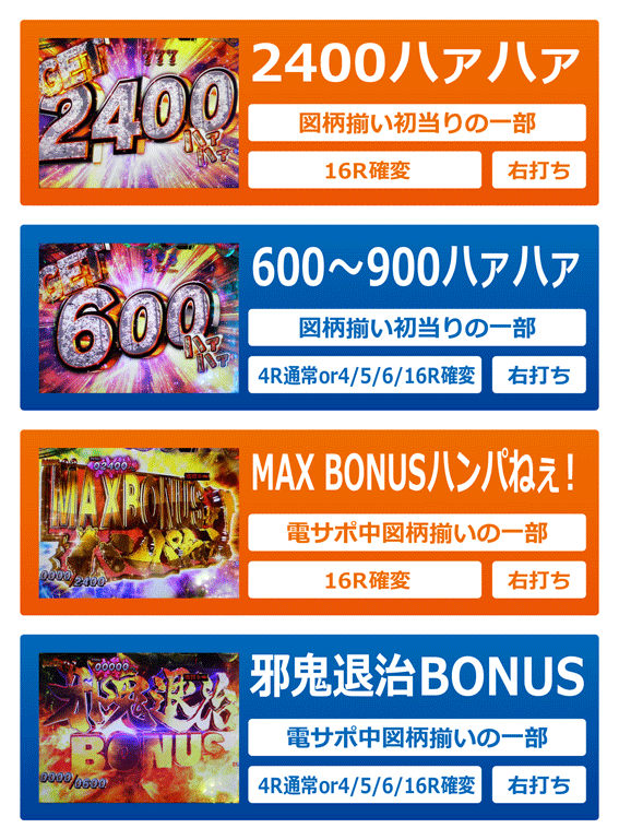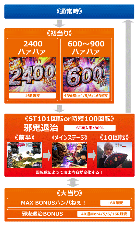 通常時に発生する16R確変大当り。終了後はSTの邪鬼退治へ移行する。