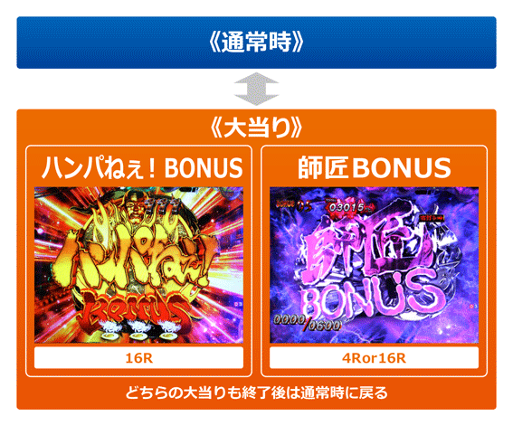 通常時に発生する4R大当り。消化中の16R昇格もあり。終了後は時短やSTへ突入することなく通常時に戻る。