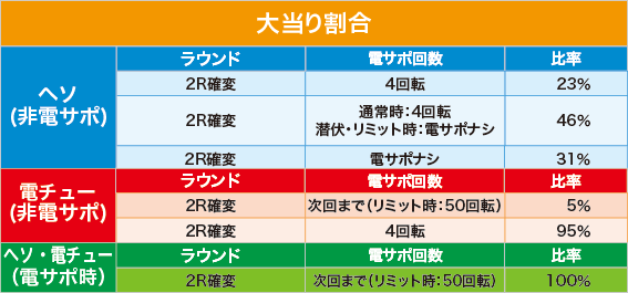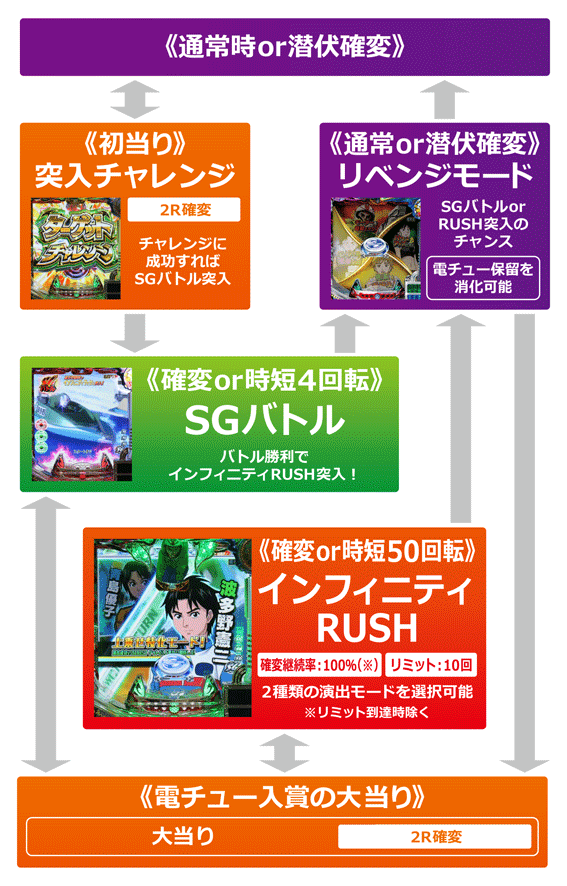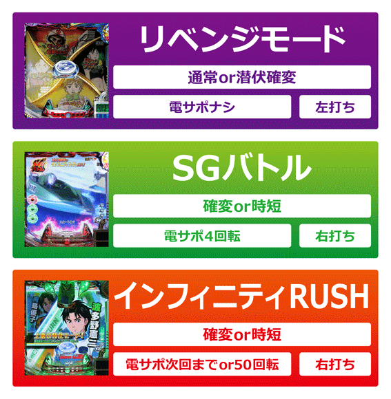 通常時の大当りはすべて確変(リミット到達時は通常へ移行)だが、電サポ回数は0or4回転のため、電サポなし時は潜伏確変状態であることが多い。また、SGバトルorインフィニティRUSH終了後に移行するリベンジモードでは電チュー保留を消化でき、電チュー保留で当たればSGバトルorインフィニティRUSH突入濃厚となる。
