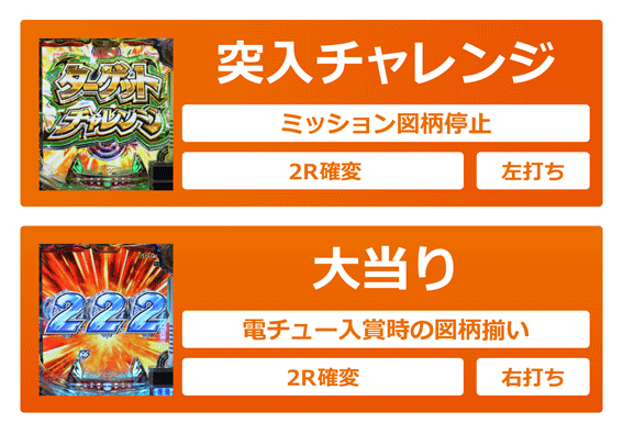 ミッション図柄停止で発生する、ヘソ入賞での2R確変大当り。ゲームの流れとしては、まず突入時に左打ちで約40個の出玉を獲得。その後突入チャレンジ(全5種類)が発生し、成功すれば電サポありの大当りとなりSGバトルに突入。失敗すると電サポなしの大当りとなり通常時に戻る。発生するチャレンジの内容によって成功期待度が大きく変わるぞ。