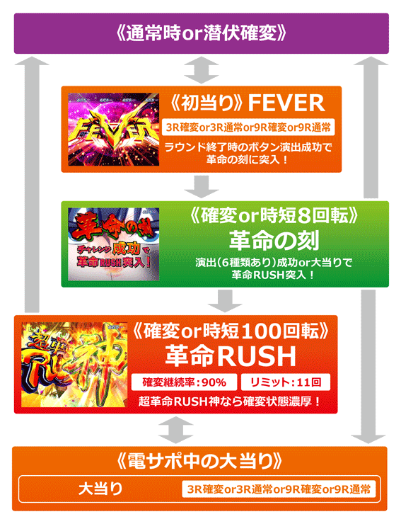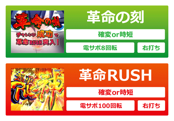 電サポなし時の大当り終了後、ボタンPUSH演出で成功すると突入。電サポ8回転の確変or時短で、内部的に確変なら8回転以内に液晶演出をクリアして革命RUSHに突入。内部的に時短だと、8回転以内に当たれば大当り後は革命RUSHへ突入するが、スルーした場合は通常時(潜伏確変の可能性あり)に戻る。