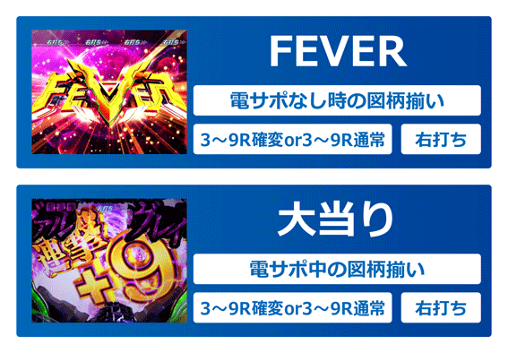 赤図柄揃いは9R確変or9R通常、青図柄揃いは3R確変or3R通常。終了時に発生するボタン演出に成功すれば革命の刻に突入し、失敗すると通常時(潜伏確変の可能性あり)に戻る。