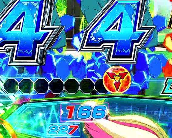 革命RUSH中の大当りは「連撃+3」or「連撃+9」と表示され、数値=ラウンド数となる。特別な専用演出はなく、連撃数(1連撃=1R)がプラスされていくぞ。なお、基本的に青図柄揃いが3R確変or通常、赤図柄揃いが9R確変or通常、V図柄揃いが9R確変となる。