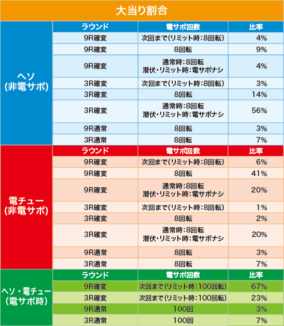 確変突入率は90%だが、電サポなし時だとその多くは電サポ8or0回転となり、電サポ終了後は潜伏確変状態となる(見た目は通常時と同様)。いかに電サポ8回転で大当りを引けるか、または電サポ次回までの大当りを引けるかが重要だ。