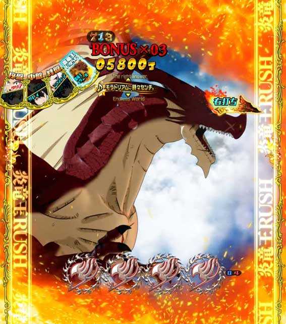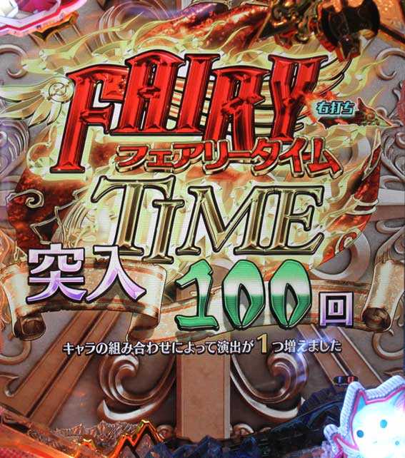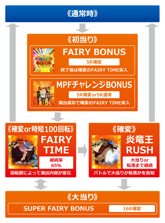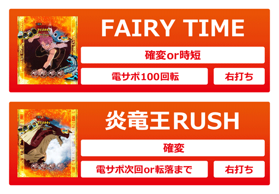 初当り後のチャレンジ演出成功で確変のFAIRY TIME、失敗で時短のFAIRY TIMEに突入。時短時、または確変中に転落した場合は電サポが100回転で終わるが、転落していなければ101回転目からは炎竜王RUSHへ移行する。炎竜王RUSH中はバトル勝利で16R確変、敗北で転落となり通常時に戻る。