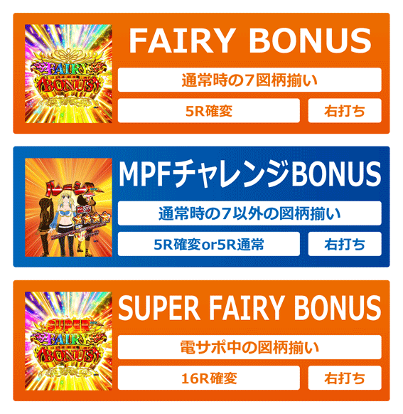 電サポ中は全大当りがこのSUPER FAIRY BONUS(16R確変)となる。ラウンド中はチャレンジゲーム(3種類)が発生。ゲームに成功すると、大当り後に突入するモード演出が変化したり、楽曲解放などのお楽しみ要素をゲットできるぞ。ただし、失敗しても出玉に影響することはない。