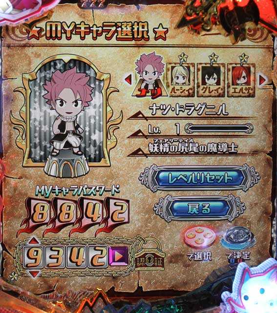 待機中にメニュー画面を開くとMyキャラを選択できるようになる。選んだキャラのレベルをパチンコを遊技して一定値まで上げると、演出カスタマイズができるようになる。なお、キャラのレベルはパスワードで次回の遊技に引き継げるぞ。