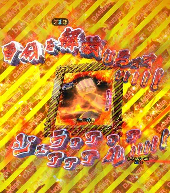 ・タイトル(赤・金・DANGER柄) ・イルミ擬音変化予告 (赤ロゴ・赤擬音) ・必殺技飛び出し予告 (金・DANGER柄) ・当落ボタン予告 (スピニングフラッシュ・ラッキーパト) |