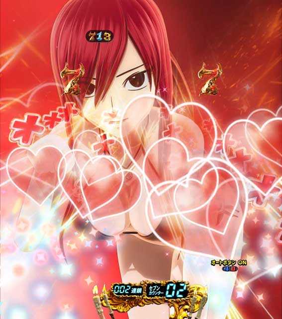 図柄揃い直後は7図柄揃いへの昇格演出が展開(発生しない場合もあり)。ナツが火を吹いて7図柄が揃って出現すると確変昇格濃厚だ。