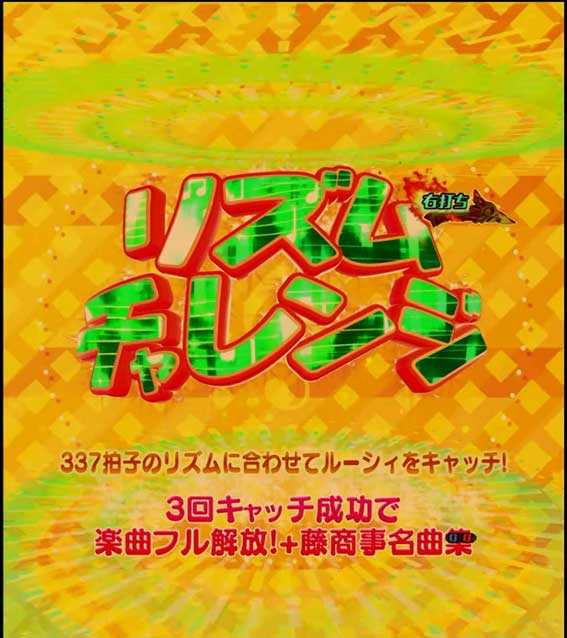 337拍子のリズムに合わせてボタンを押し、3回ルーシィをキャッチできれば成功。最初の3拍子は「ピッ・ピッ・ピッ」と音が出るので、最後の「ピッ」に合わせてボタンを押せば簡単に成功するが、2回目の3拍子と7拍子は無音になるため、自分の頭の中で337拍子のリズムに合わせてボタンを押す必要がある。クリア難易度は高いが、成功すればCR FAIRY TAILの楽曲全9種に加え、藤商事の名曲集(全5種)も解放される。