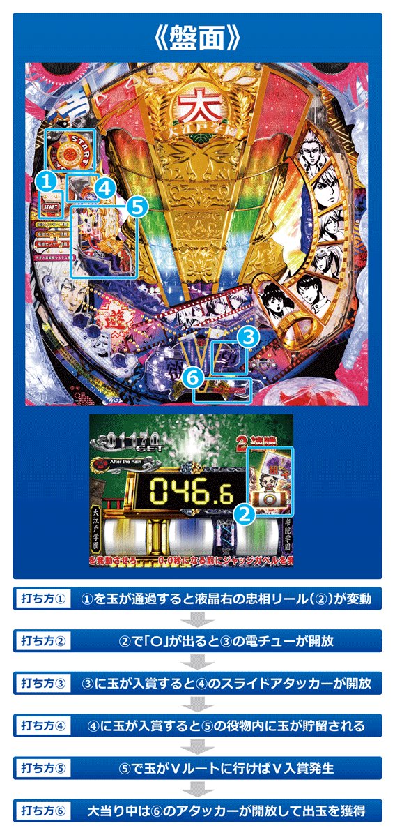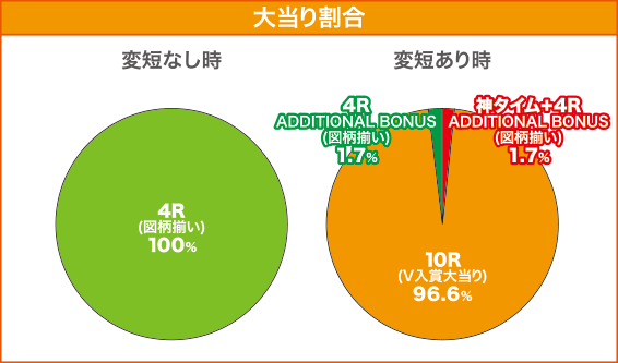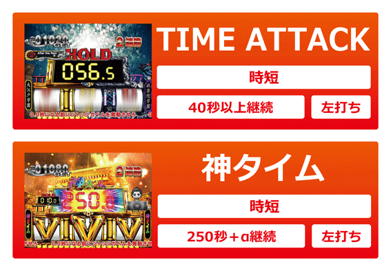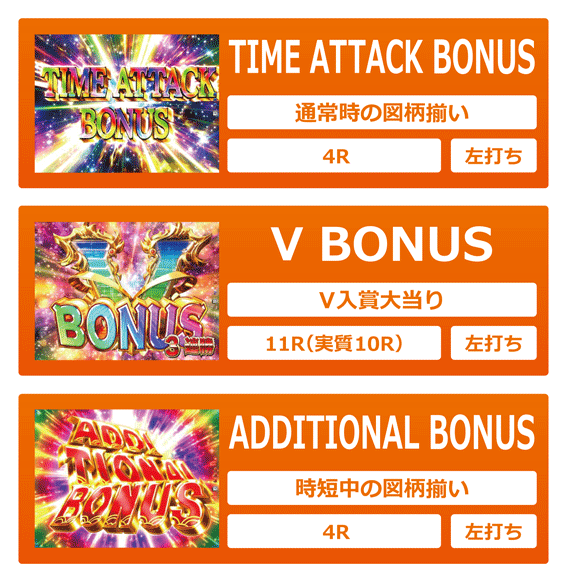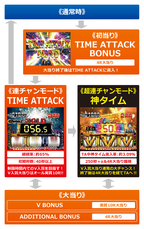 通常時はすべての図柄揃いがTIME ATTACK BONUS(4R)となり、終了後にTIME ATTACK(TA)へ突入。TA中は制限時間内にV入賞でV BONUS(実質10R)、図柄揃いでADDITIONAL BONUS(4R)となる。制限時間が0になると通常時へ戻るぞ。また、TA中に画面が消灯すると神タイムへ突入。神タイム中のゲーム性はTA中と同じだが、制限時間が250秒以上となるためV入賞による大当り連打が期待できる。