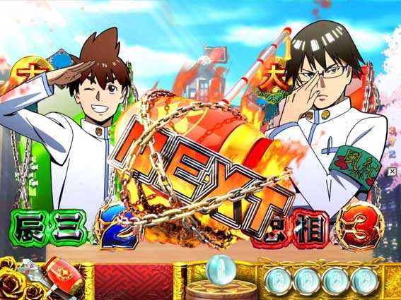 ・変動開始時校章役物落下演出 ・NEXT図柄連続演出(3連) ・一時停止演出 ・チャンス目演出 |