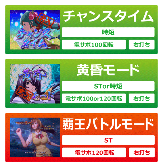 電サポ中の偶数図柄当りにてST継続が告知されなかった場合に突入。時短orSTモードで、STの場合は電サポが120回転継続。背景キャラが内部ST期待度を示唆している。