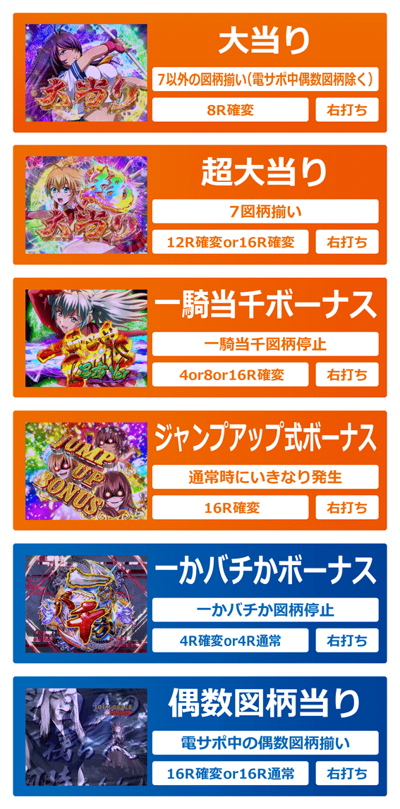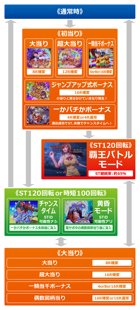 一かバチかボーナスと偶数図柄当り(電サポ中)以外の大当りはすべて確変で、終了後にSTへ突入。一かバチかボーナスは演出成功でST、失敗でチャンスタイムに突入。偶数図柄当りは演出成功でST、失敗で黄昏モード突入となる。