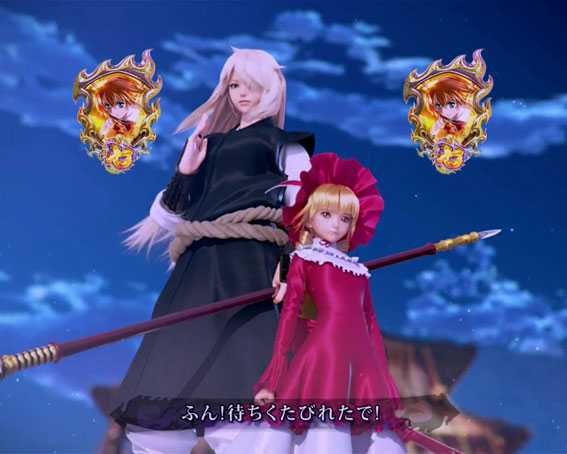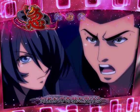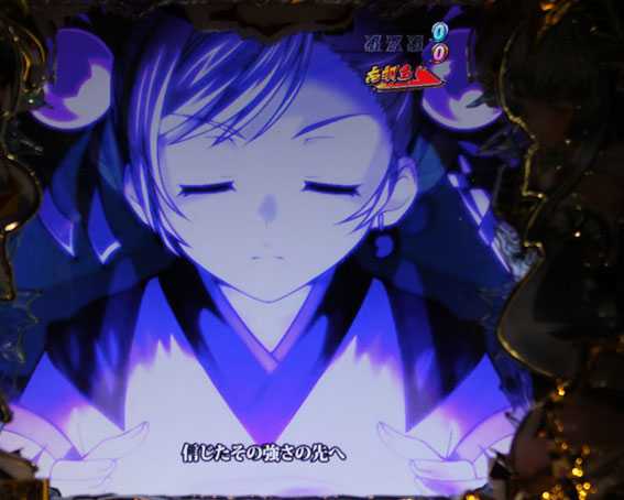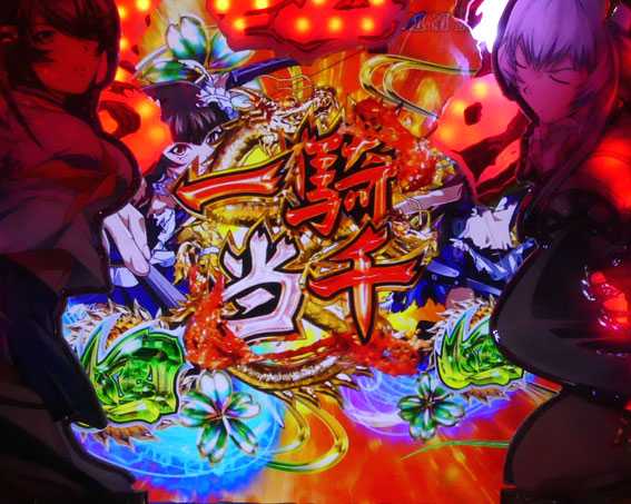 一騎当千図柄停止で発生するランクアップ式確変大当り(4Ror8Ror16R)。節目のラウンドで勾玉を破壊するたびにラウンド数がアップする。終了後はSTに突入。