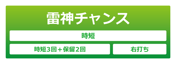 通常時の大当り終了後は、雷神ルーレットで時短突入か否かを告知。最終的にルーレット内を移動する光が「チャンス」の部分(緑に光っているランプ)で止まれば時短突入だ。ルーレットパターンは複数あり、それぞれ時短突入期待度が異なる。