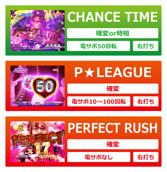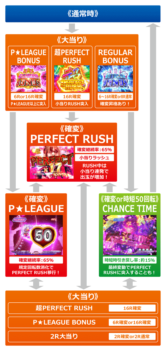 通常時は図柄揃いで大当り。その後の再抽選演出で大当りの種類が告知される。PERFECT RUSH(確変&小当りラッシュ)中は超高確率で小当りが発生し、次回大当りまで出玉を増やすことが可能。P★LEAGUE(電サポありの確変)は、規定回転数消化でPERFECT RUSHに昇格するぞ。CHANCE TIMEは内部的に確変の可能性があり、その場合は最終回転でPERFECT RUSHに突入する。