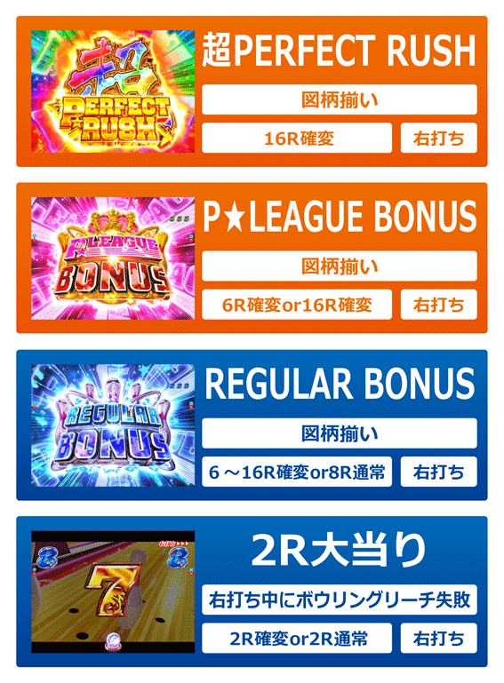 REGULAR BONUS(RB)&P★LEAGUE BONUS中は、6R終了時にピンギミックとボウリングギミック作動で16R確変に昇格。また、RB中に次回予告が発生した場合は6R確変へ昇格し、大当り後はP★LEAGUEに突入する。