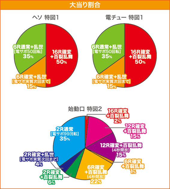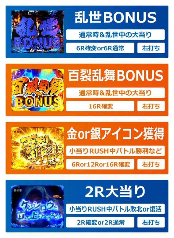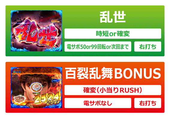 基本的には6Rの確変or通常大当りで、終了後は乱世に突入。ただし、大当り発生直後に百裂乱舞BONUSへ昇格することもある。