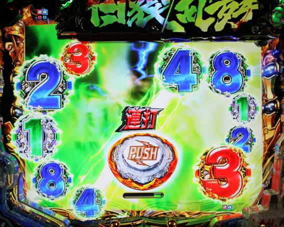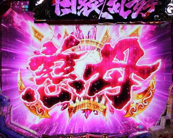通常時や乱世中に図柄が揃うと、ボタンPUSHで大当りの種類を決定する再抽選演出が発生。百裂乱舞BONUS当選に期待したい。表示されるボタンアイコンが普段と違うと百裂乱舞BONUS当選期待度がアップする!?
