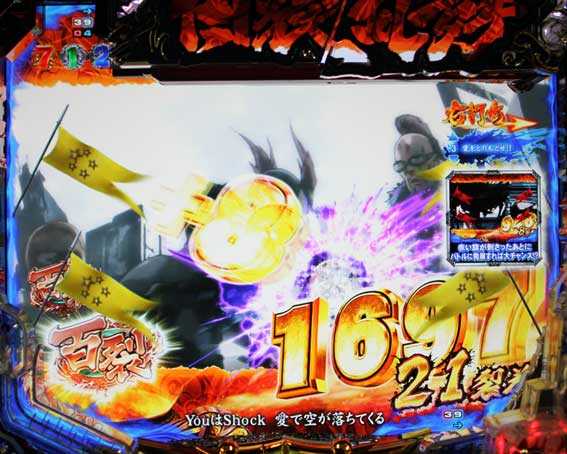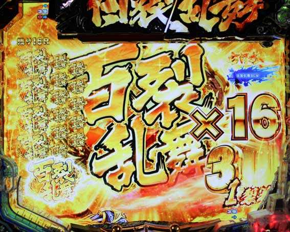 通常時or乱世中に図柄が揃い、その直後のボタンPUSH演出で「百裂乱舞BONUS」と表示されると発生。16R確変大当りで、16R分の出玉獲得後は小当りRUSHへ移行する(液晶では百裂乱舞BONUSが継続)。