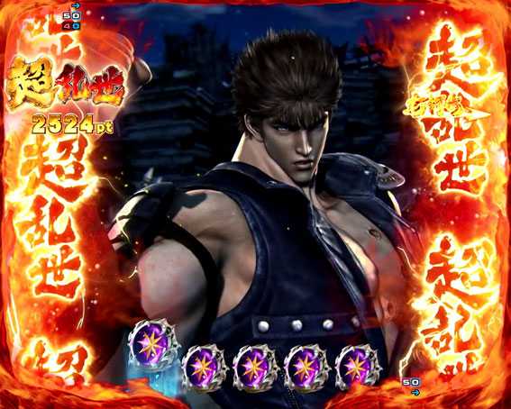 小当りRUSH中のバトルでケンシロウが敵の攻撃を食らうと2R大当りが発生。2R分の出玉獲得後にケンシロウが倒れると乱世突入。耐える、または復活発生なら小当りRUSH継続だ。