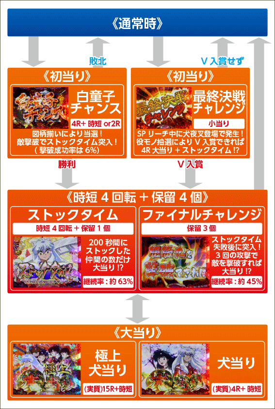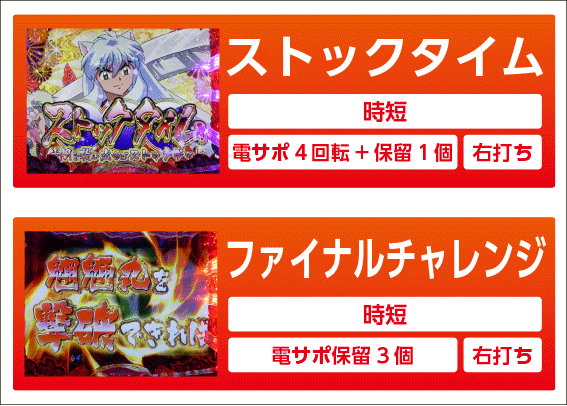 最終決戦チャレンジ成功or白童子チャンス勝利or電サポ中の大当り後に突入する電サポモード。本機の電サポは時短4回転+保留4個の合計8回のチャンスがあり、この間は小当り≒大当りとなる為、実質大当り確率が1/5.5と大幅にアップする。前半(時短4回転+保留1個)は、ストックタイムとなり必ず200秒継続。この間に獲得できた仲間の数だけ大当りが濃厚に!? 200秒経過すると仲間が出陣し、「極上犬当り」or「犬当り」がスタートする。5回転以内に大当りを引ける割合は約63%だ。仲間を一人も獲得できなかった場合は、2ndチャンスの「ファイナルチャレンジ」へ突入するぞ。