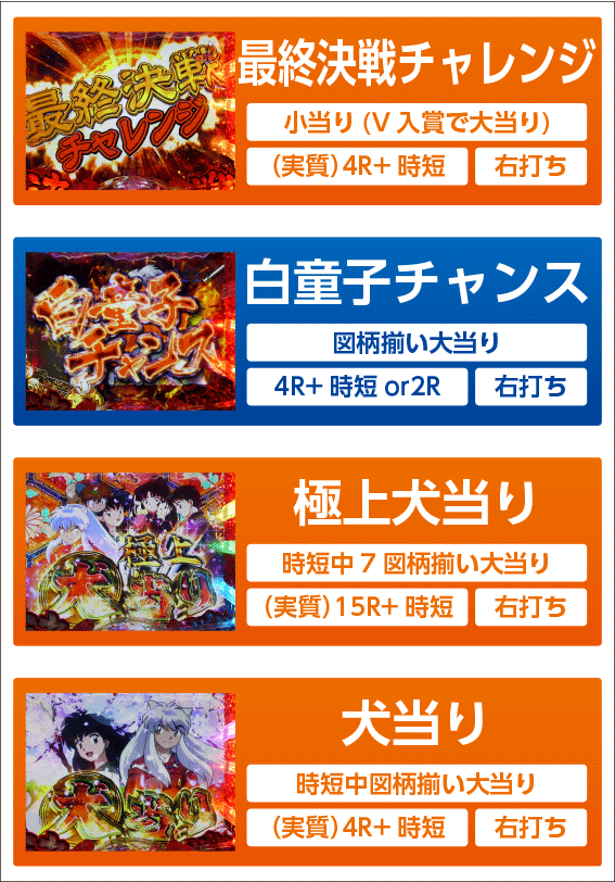 SPリーチ中の犬夜叉登場などにより最終決戦図柄が止まると当選する小当り。画面の指示に従って右打ちして役モノ内に玉を入賞させよう。