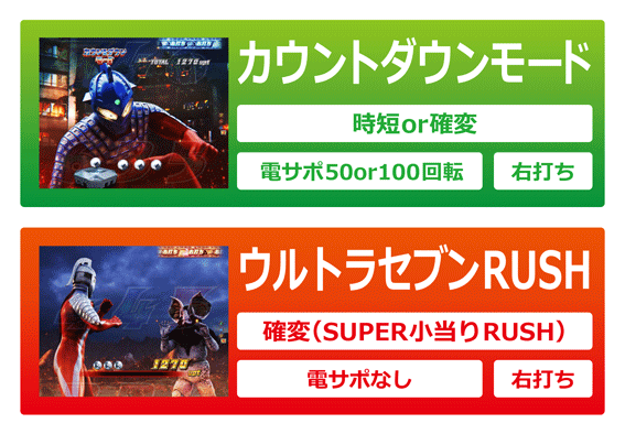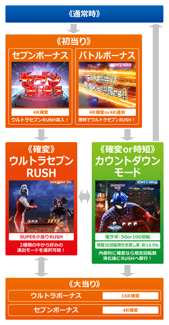 初回大当りが7揃いなら大当り後にウルトラセブンRUSHへ突入。7以外の図柄揃いはラウンド中バトルで勝てばRUSH突入となる。RUSH中の演出は2種類あり、好みのものを選択可能。どちらの演出もバトル勝利で16R確変、負けると少量の出玉を獲得した後にカウントダウンモード(確変or時短)へ移行する。カウントダウンモードは、内部的に確変なら規定回転数消化後にRUSHへ突入する。