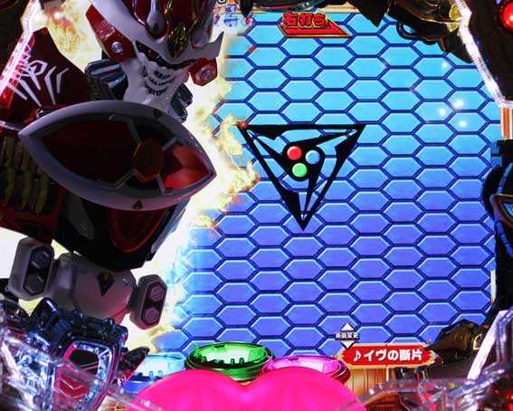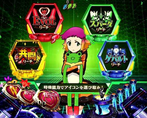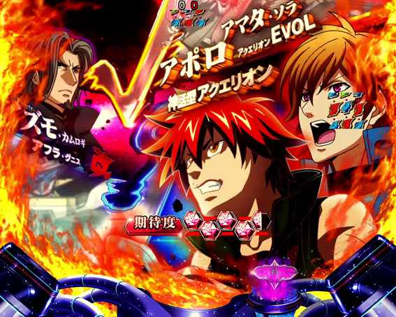 演出では盤面左側に搭載された「EVOLギミック」と、右側に搭載された「初代ギミック」が特徴。EVOLギミック合体で「EVOLリーチ」に発展、初代ギミック合体で「ソーラーリーチ」に突入する。さらにWギミックが合体すれば本機最強リーチ「共闘リーチ」に発展する仕組みだ。その他では最新作「アクエリオンロゴス」の演出も初搭載されているところもポイント。