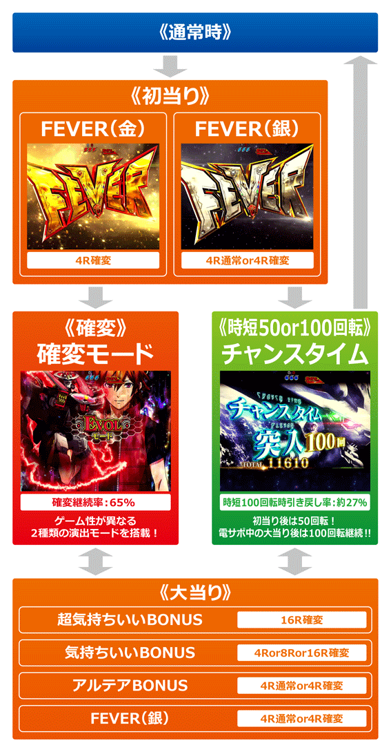 確変(EVOLモード)中に青図柄が揃うと発生する4R通常大当り。「FEVER(銀)」同様、エンディングで4R確変に昇格する可能性がある。