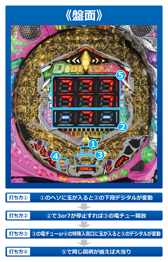 通常時はまず、ヘソに玉が入ると②の下段デジタルが変動し、3or7が停止すると③の電チューが開放。電チューに玉が入ると⑤の上中段デジタルが変動し、最終的に同一図柄が1ライン以上で揃えば大当り。ただし、②で3or7が停止せずとも③の電チューがショート開放するため、タイミング次第では電チューに玉が入ることもあり。