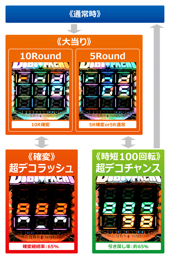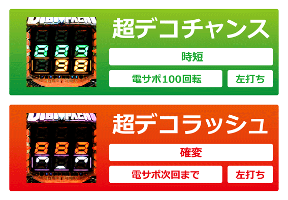 同一図柄がダブルラインで揃うと発生。10Rの確変大当りで、終了後は超デコラッシュに突入する。