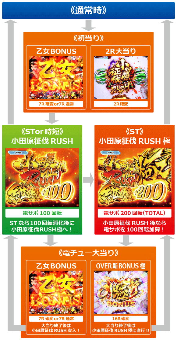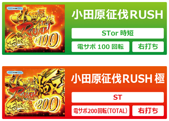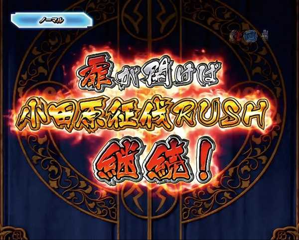 初当り後は必ず小田原征伐RUSHに突入。そして、電サポ100回転目に到達すると継続ジャッジ演出が発生し、STだった場合はこの演出に成功して小田原征伐RUSH極に昇格する(小田原征伐RUSH&小田原征伐RUSH極のTOTAL電サポ回数は200回転)。電チュー大当りの場合は、7R大当り後なら通常時と同様に小田原征伐RUSHへ。16R大当り後なら最初から電サポ200回転が告知される小田原征伐RUSH極スタートとなる。