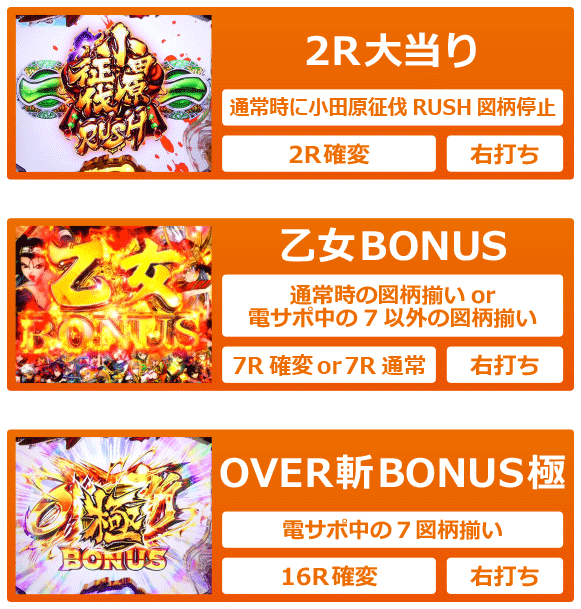 通常時の全ての図柄揃い&電サポ中の7以外の図柄揃いで突入する7R確変or7R通常大当り。7R大当り後の小田原征伐RUSHは、STではなく時短である可能性の方が高い。