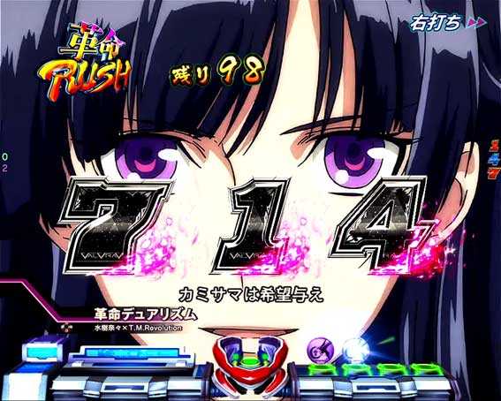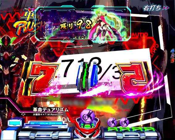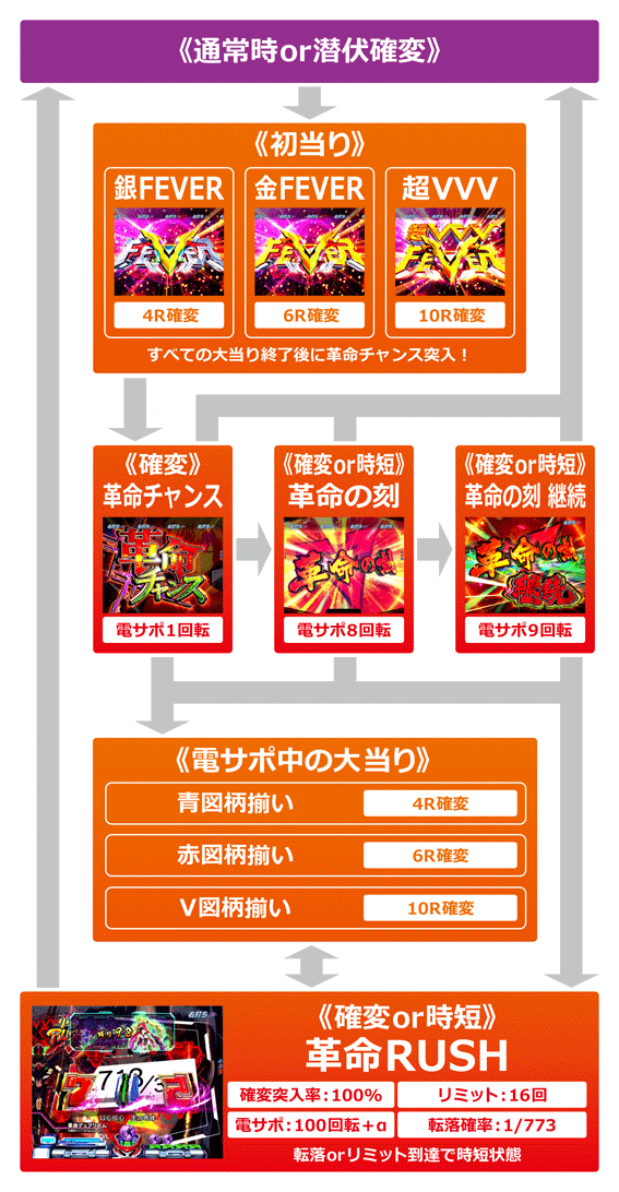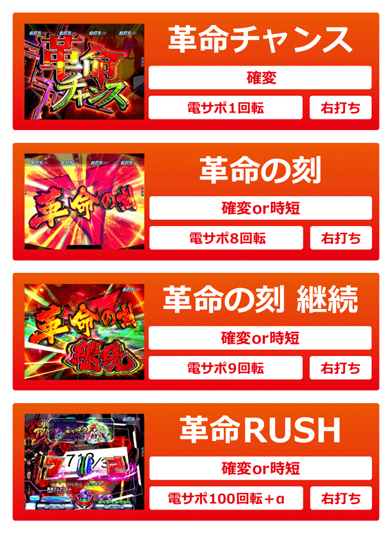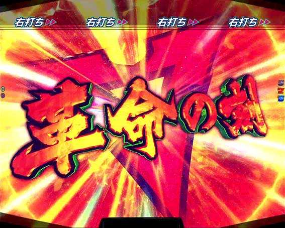 ゲーム性は、初当り後は電サポ1回の「革命チャンス」に移行、継続すれば電サポ+8回の「革命の刻」、さらに継続すれば電サポ+9回の「革命の刻 継続」へと移行する。この電サポ中に大当りすれば電サポ100回+αの「革命RUSH」に突入。革命RUSH中は転落しても電サポ100回が保証され、また確変状態なら100回転以降も電サポが継続する仕組みだ。