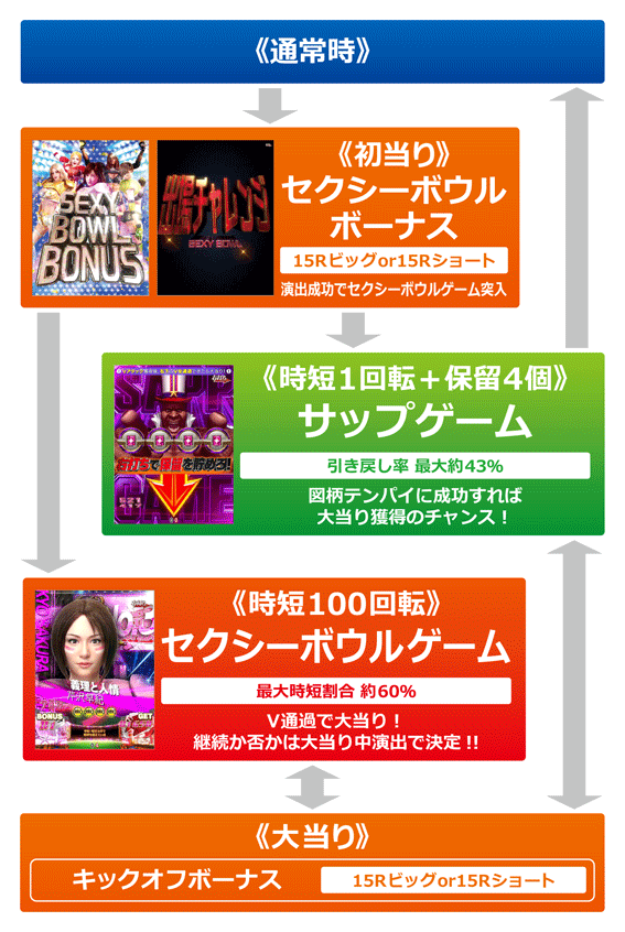 初回大当りはすべてセクシーボウルボーナスとなり、ラウンド中演出に成功でセクシーボウルゲームへ、失敗でサップゲームへ移行(復活もあり)。セクシーボウルゲームはV通過で大当りとなる100回転の時短で、ほぼ次回大当り発生が濃厚。サップゲームは時短1回転と保留最大4個の、計5回の大当りチャンスがあり、引き戻し率が約43%と高いのが特徴だ。