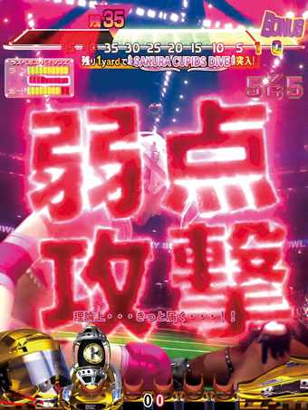 演出はアメフトをモチーフにし、スーパースキルアップゾーン予告、期待度革命予告、サクラキューピッズダイブリーチなどから大当りを狙う。また、通常時にボブ・サップの実写が出現すれば大チャンスだ。