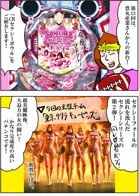『CRセクシーフォール』に続くセクシーシリーズ第2弾で、アメフトにフォーカスした機種。スペックは1種2種混合タイプで、大当り確率1/319.7、最大時短割合はヘソ35%・電サポ60%で、時短回数は1回(引き戻し率最大約43%)or100回(次回継続濃厚)だ。初当り時は時短100回の「セクシーボウルゲーム」を賭けた「出場チャレンジ」が発生し、成功すれば突入、失敗しても時短1回(最大保留4個)の「サップゲーム」に突入する。また時短中は「キックオフボーナス」によって時短回数が決まる仕組みだ。
