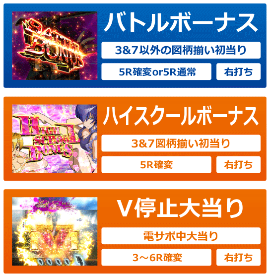 3キャラの役物が全可動する「ハーレムアタック」を機に発生。いずれも発生時点でアツいが、チャンスアップの有無も重要だ。