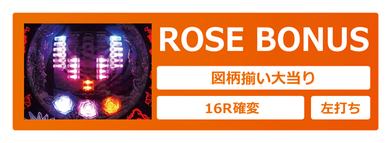 ゲーム性は左打ちで盤面左側にある「S」チャッカー(特図1)を狙う。さらにそこからこぼれた玉が盤面中央下部の「GO」を通過するとミニローズが点滅し、同色で点灯するとGO下にあるアタッカー型の電チュー(特図2)が開放、入賞すればデジタル回転となる。つまり、特図1を狙いつつ特図2でも同時に抽選しながら大当りを狙う仕組みだ。大当り確率はどちらも同じだが、電チュー入賞経由で大当りすれば電サポ回数はすべて120回となる。演出は主に一発告知となり、非常にシンプルだ。