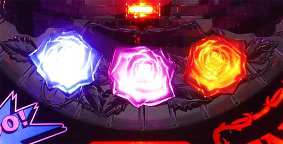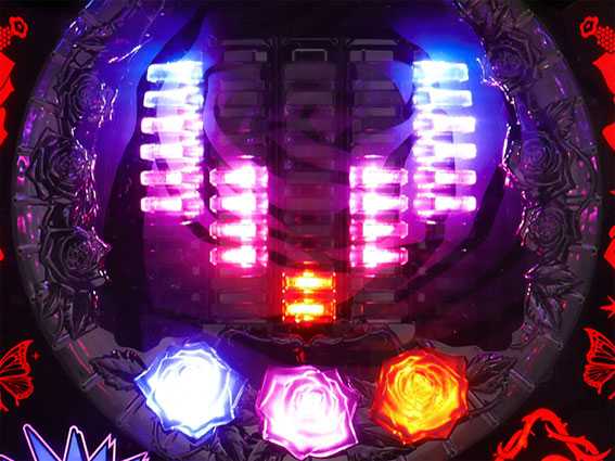 玉がゲート(盤面中央下部と盤面下部の2か所)を通るとパトドット下部の3連ミニローズが点灯。3つのミニローズがすべて同じ色に光ると電チューが開放するぞ。なお、ミニローズが光る色のパターンは複数あり、色によって開放時間を示唆している!?