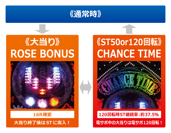 全大当り終了後に突入するST。電サポ回数は50回転or120回転で、電チュー入賞による大当り後なら電サポ120回転濃厚。電サポが50回転で終わった場合、以降は70回転の潜伏STとなるが、ST中の大当り確率は通常時の大当り確率とあまり変わらない(通常時:約1/258 ST中:約1/255)。潜伏STの恩恵がほぼないため、電サポ抜け後は即ヤメしてもOKだ。