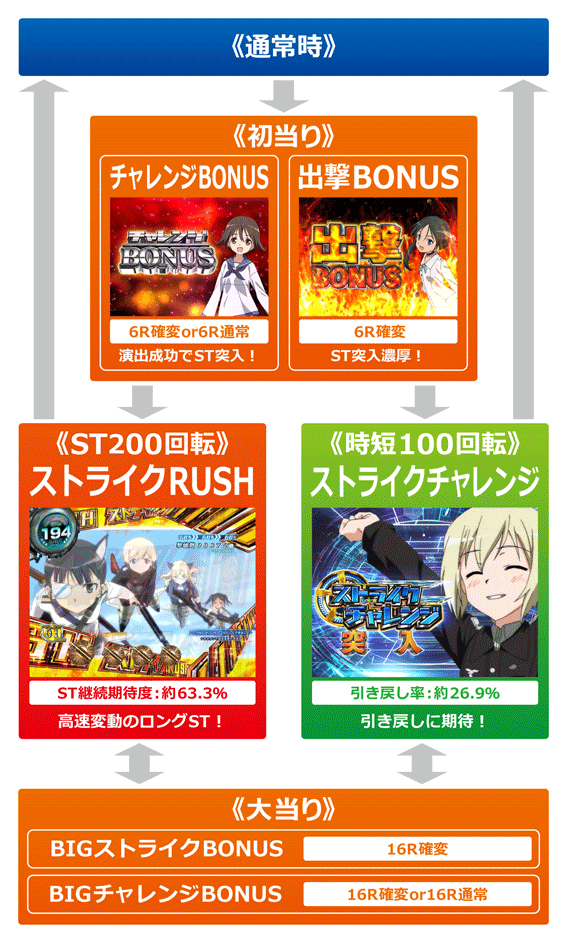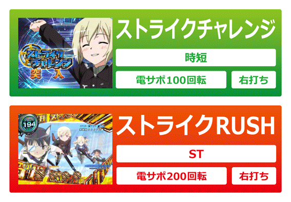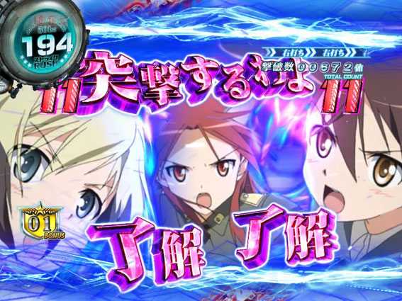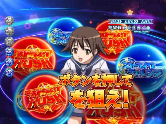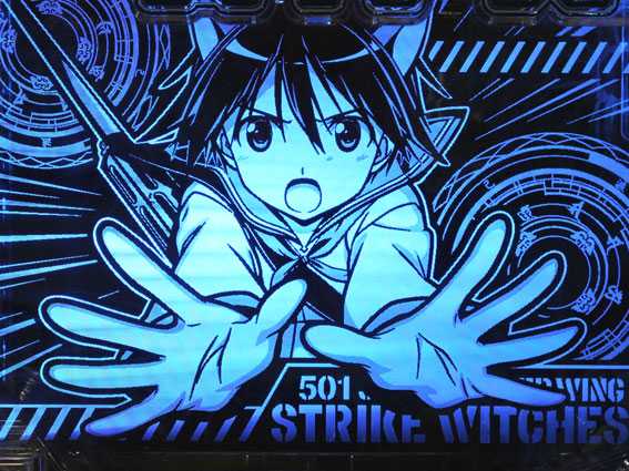 本機は人気アニメ「ストライクウィッチーズ」のタイアップ機。スペックは大当り確率が約1/319.6、ST突入率50%(電チュー75%)・ST回数200回のV確STタイプ。ST「ストライクRUSH」中の大当りはオール16R・約1760個で、さらにST中の次回大当り期待度が約84.4%と連チャンの期待度が高くなっているのが特徴だ。