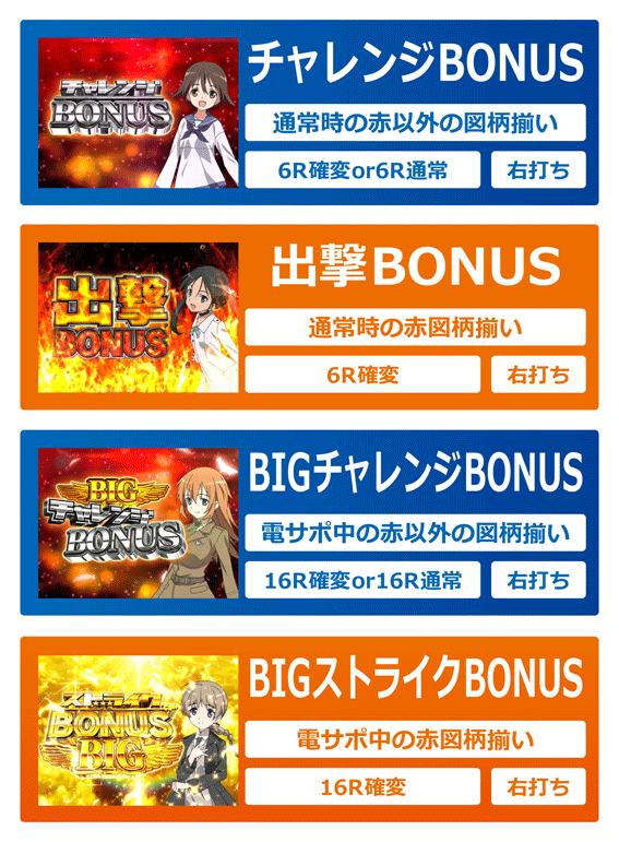 電サポ中に赤以外の図柄が揃うと発生する16R大当り。ラウンド中は通常時のチャレンジBONUSと同じ昇格演出(4種類あり)が展開。成功すればST、失敗なら時短突入となる。